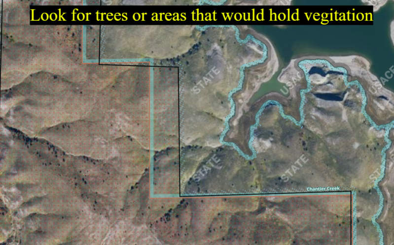 Food Sources: Locate potential food sources such as open fields or agricultural areas where deer graze. These spots are crucial for planning your hunting strategy. For this particular area, you would want to look in the creek bottoms, banks, and areas in the draws. Most likely deer will graze through as they travel.